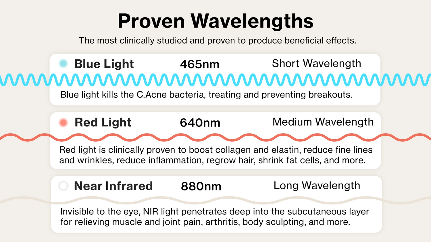 La luce rossa, la luce blu e vicino infrarosso sono le più clinicamente studiate e con effetti benefici più comprovati. Celluma utilizza tutte e tre le lunghezze d'onda in modo sinergico, con dosi che dipendono dal tipo di protocollo di trattamento, per condizioni quali invecchiamento cutaneo, acne, perdita di capelli, dolori muscolari e articolari, ferite e adipe in eccesso.